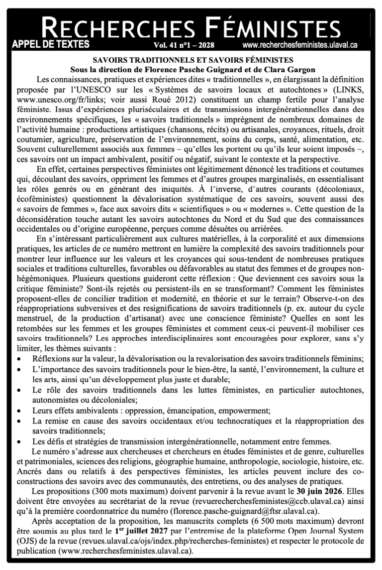 « Savoirs traditionnels et savoirs féministes » Date limite pour les propositions : 30 juin…