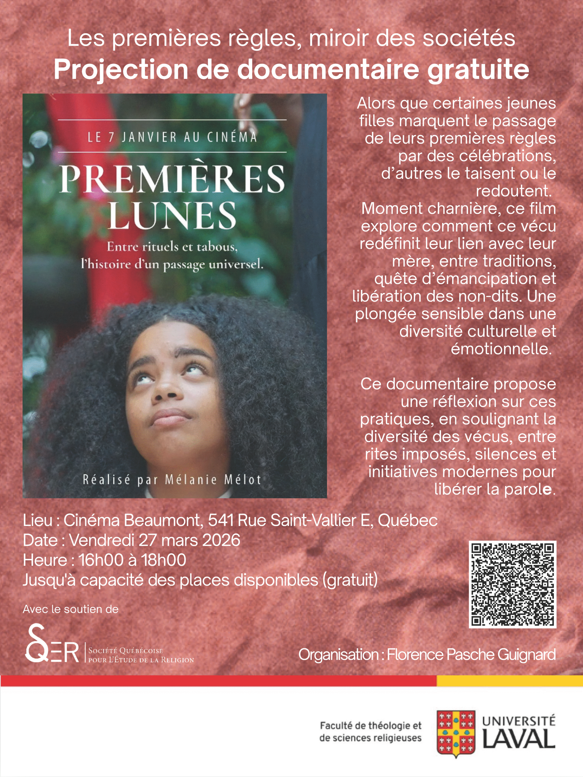 Cette projection gratuite est organisée par Florence Pasche Guignard, professeure agrégée à l’Université Laval (FTSR). Elle sera suivie d’une discussion avec Clara Gargon, doctorante en anthropologie (FSS, Université Laval) et Daphnée Dion-Carrier, doctorante en sciences des religions (FTSR, Université Laval), puis d’un échange avec le public en salle.